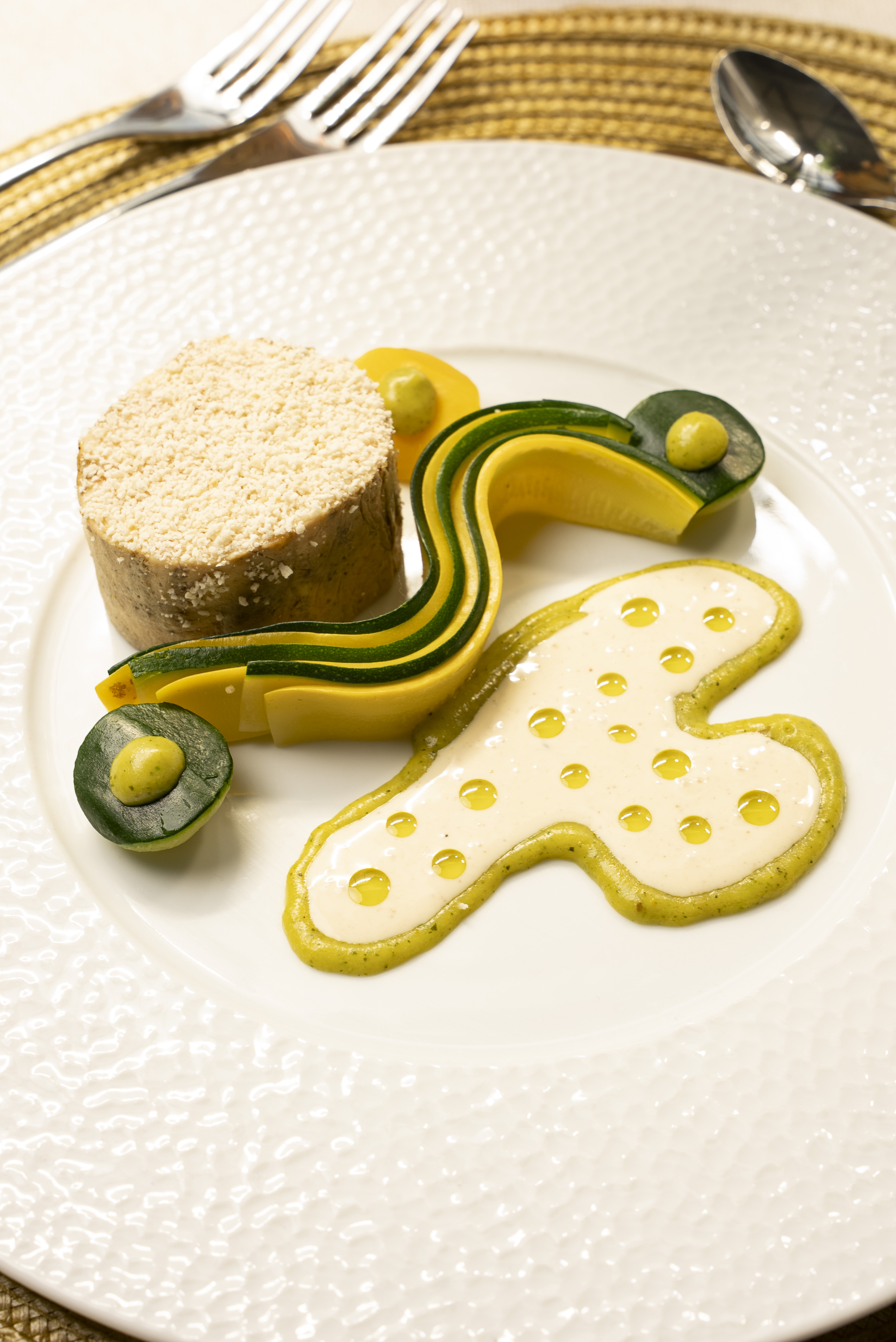 - ⁠Ballotine de volaille au panko, déclinaison de courgette, sauce poulette marbrée