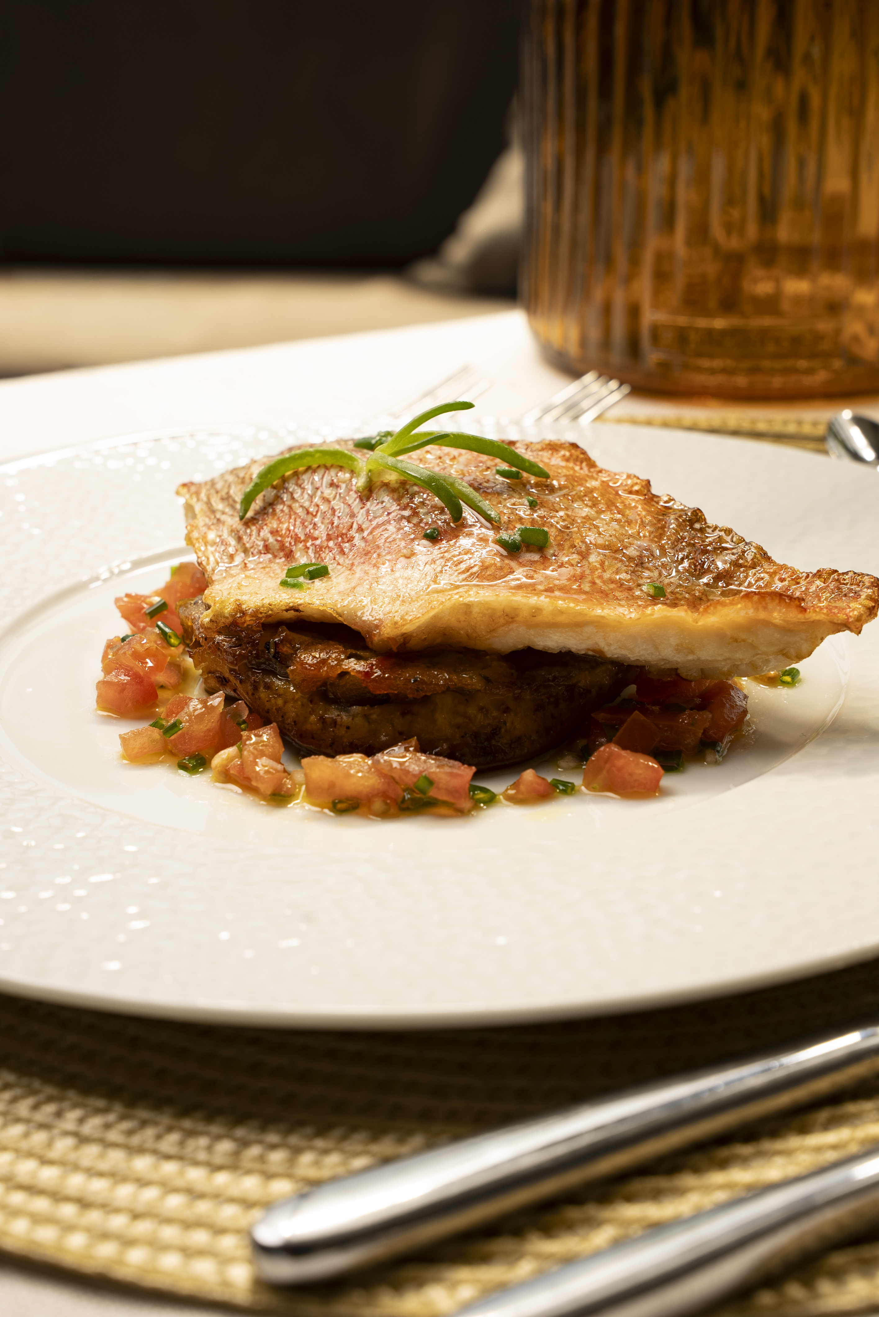 Plat : Filet de dorade, tatin de légumes du soleil, sauce vierge